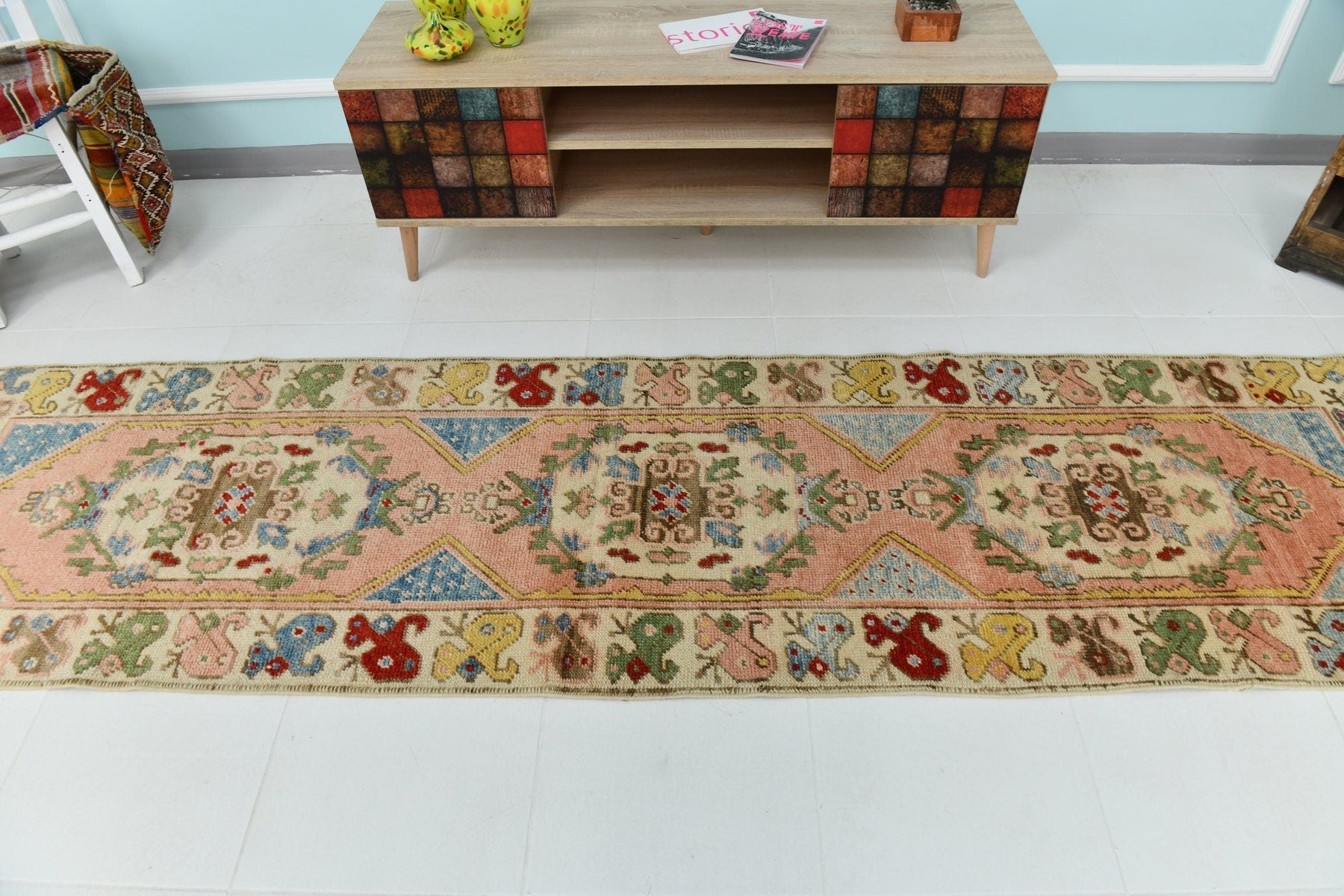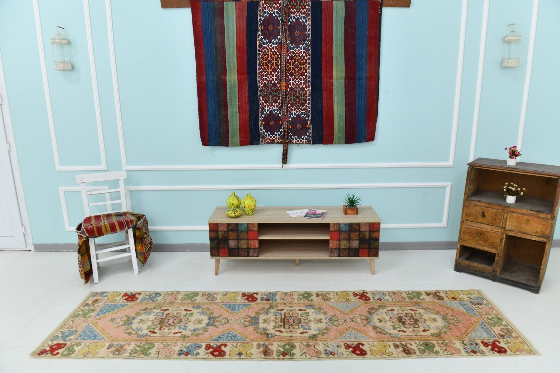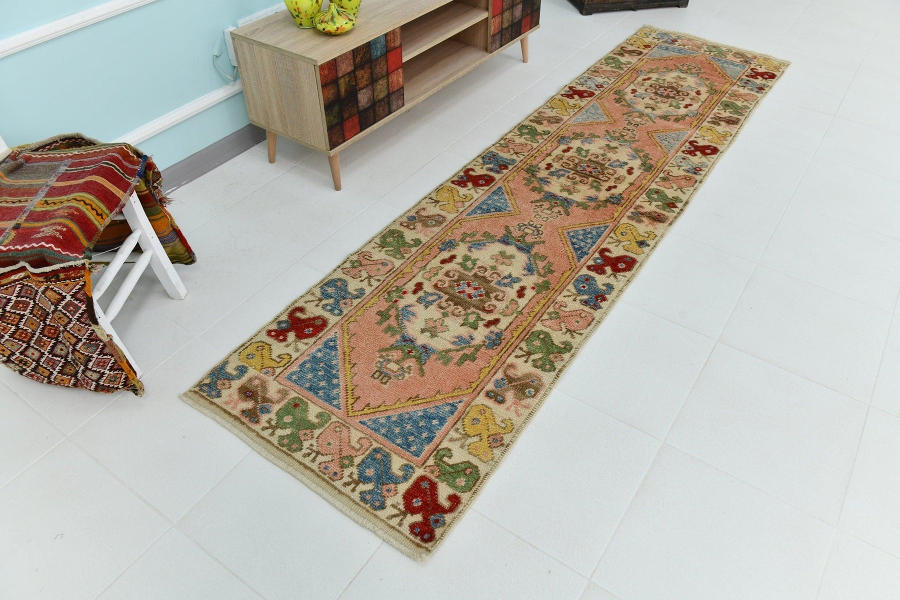 Elevate your space with this one-of-a-kind Vintage Oushak Rug. With dimensions of 2'7" x 9'11" ft size (79 x 302 cm size), this handcrafted product features a beautiful color scheme and a pattern that's sure to impress. Handwoven for unique craftsmanship, this piece is perfect for adding texture and interest to any room or area of use. Due to its vintage nature, there may be slight imperfections and signs of wear, which only add to its character. Please refer to the product details for more information.