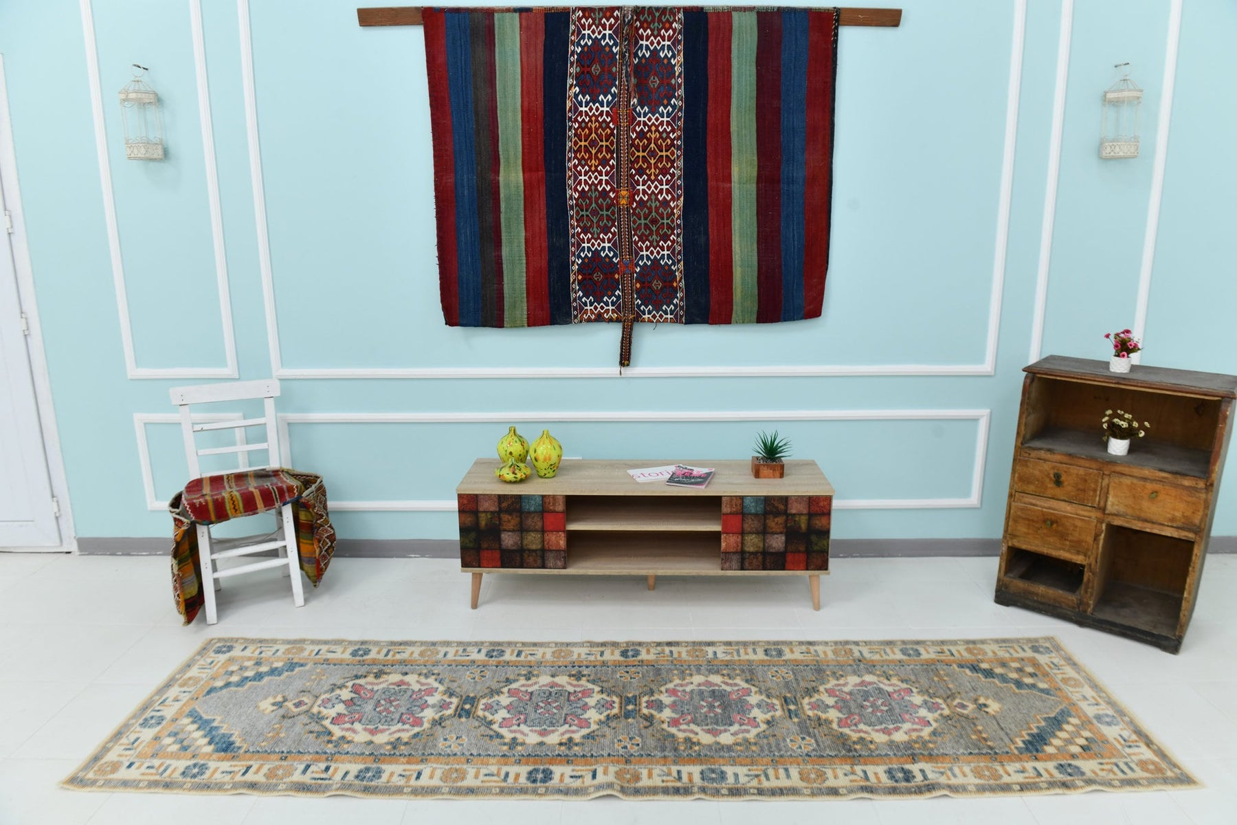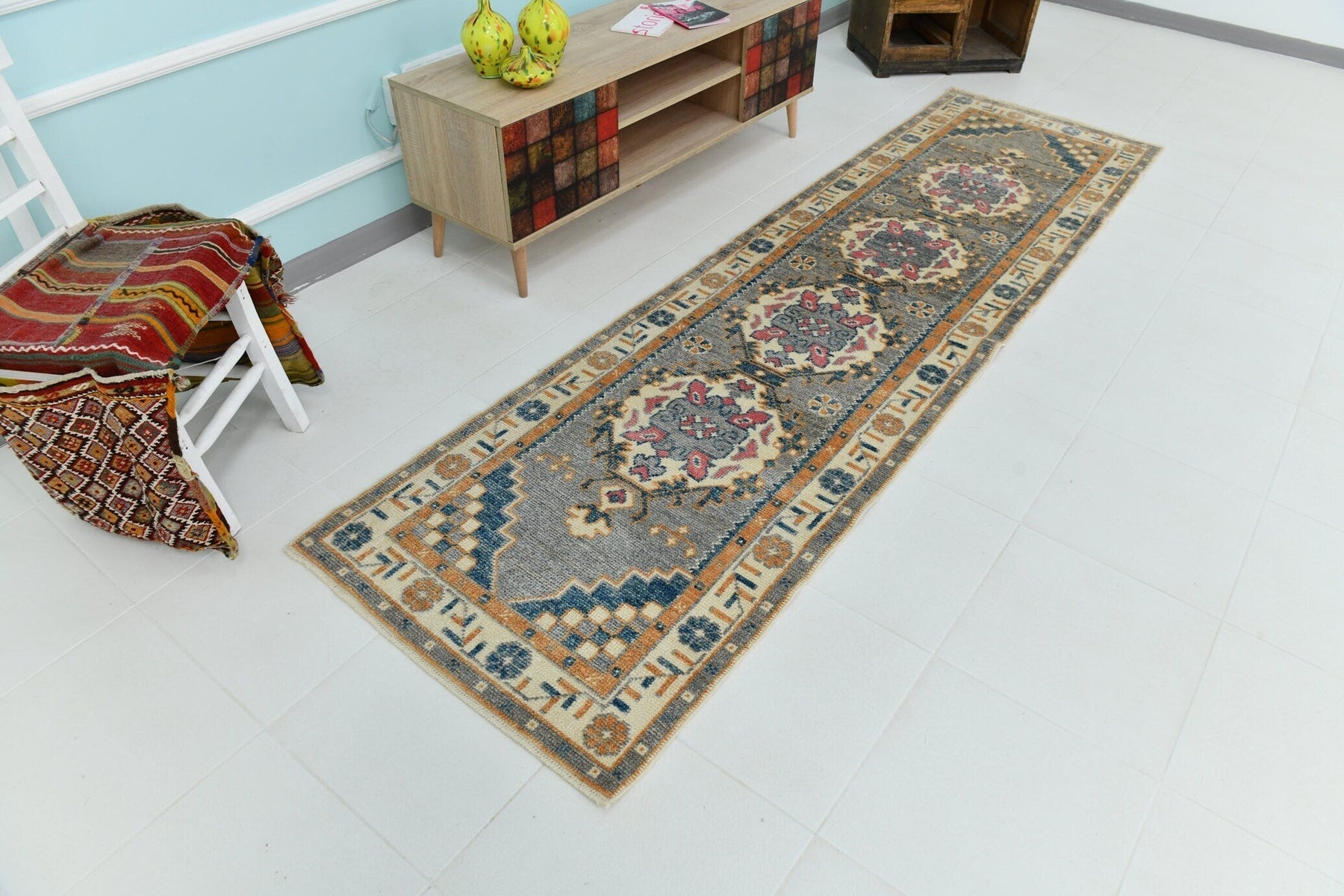 Looking for a statement piece to elevate your home decor? Look no further than this one-of-a-kind Vintage Oushak Rug. Handwoven for unique craftsmanship, this vintage beauty measures 2'9" x 10'1" ft size (85 x 308 cm size) and features a captivating color palette, accented by a Turkish-style pattern. The handmade nature of the product means that it may have some imperfections and signs of wear, but this only adds to its unique charm. Whether you want to enhance your living room, bedroom, or any other room or area of use, this product will impress. Please refer to the product details for more information.