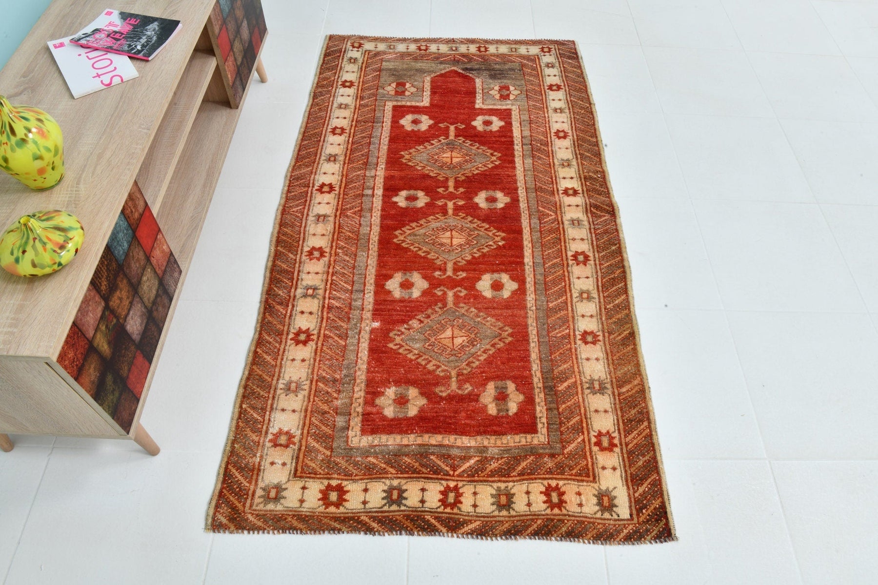 Make a statement with this one-of-a-kind Vintage Rug. Measuring 3'3" x 5'10" ft size (99 x 177 cm size), this handwoven product boasts a stunning color palette, with a vintage pattern that catches the eye. The vintage nature of the product means that it may exhibit signs of wear and tear, but we see this as a testament to its unique character. Handwoven for unique craftsmanship, this product is perfect for any room or area of use in need of a pop of color and texture. Please see the product details for more information.