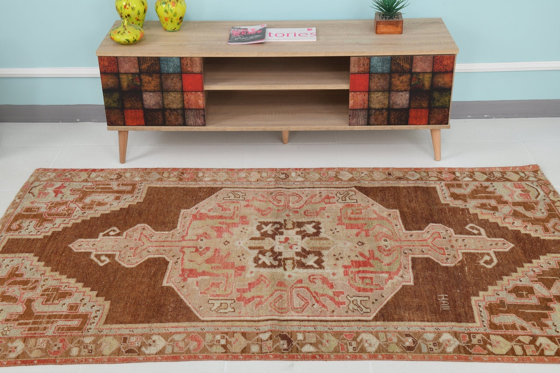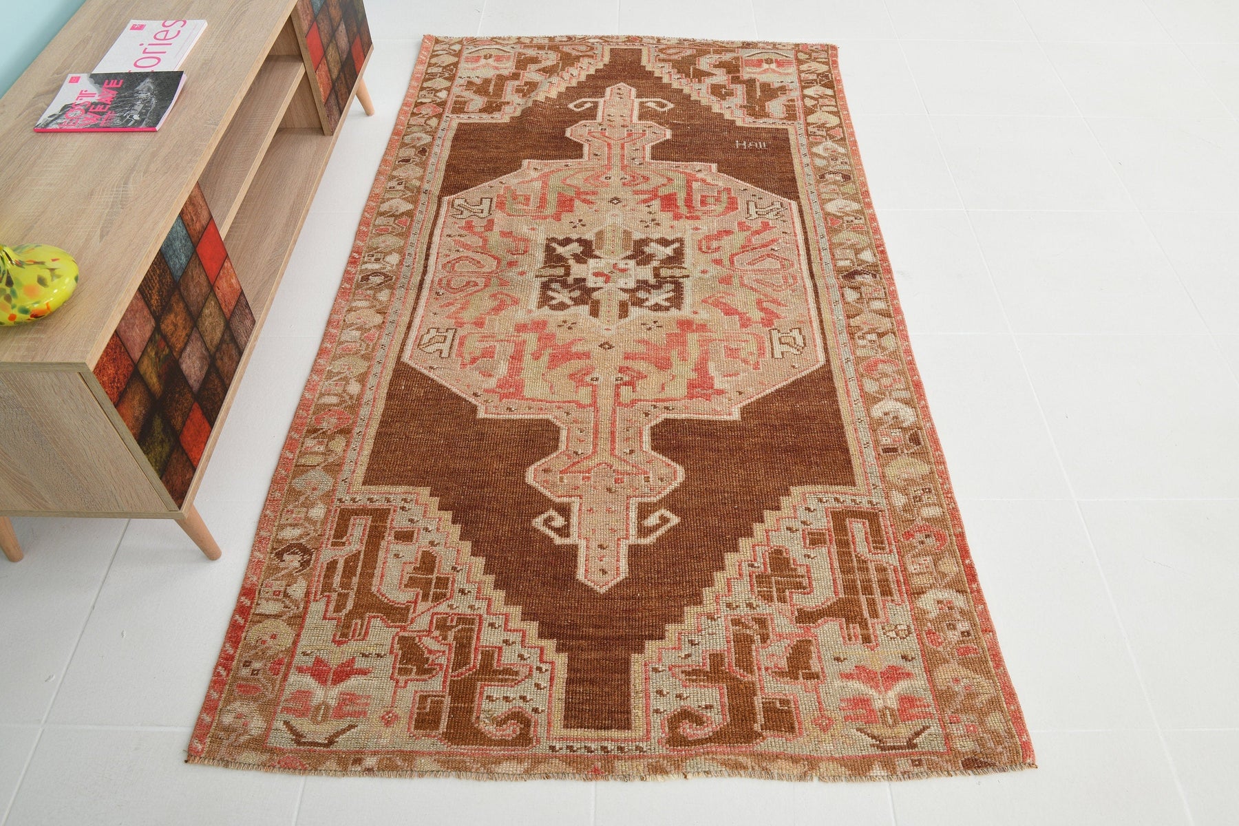 Add a touch of elegance to your decor with this one-of-a-kind Vintage Rug. Measuring 3'10" x 6'9" ft size (117 x 207 cm size), this handwoven piece features a stunning color combination and a pattern that's both bold and beautiful. Handcrafted for unique craftsmanship, this product is perfect for any room or area of use in need of a statement piece. Please note that due to its vintage nature, there may be slight imperfections and signs of wear, which only add to its charm. Please check the product details for more information.
