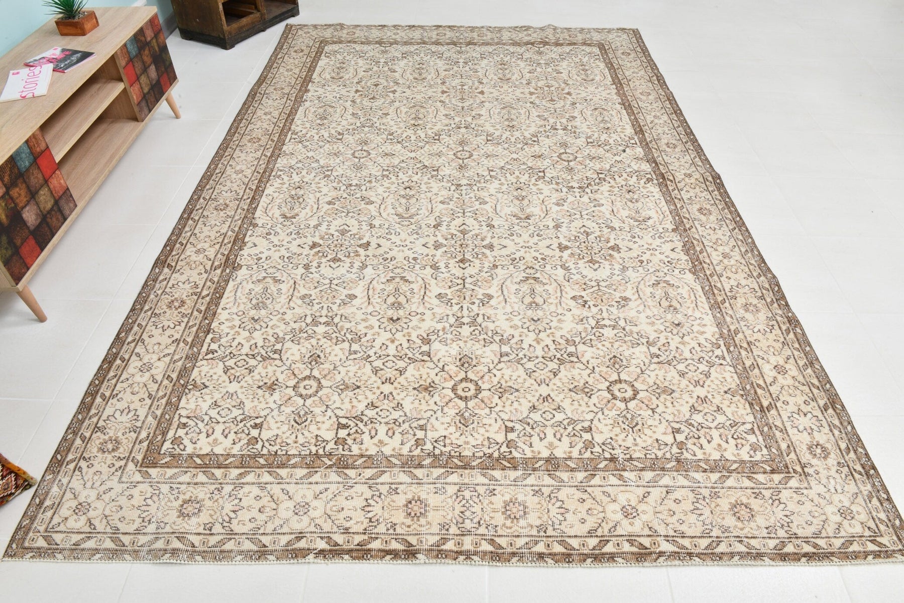 Add a touch of elegance to your living space with this one-of-a-kind handwoven rug. The product type is Vintage Rug, and its dimensions are 6'11" x 10'7" ft size (212 x 322 cm size). Handwoven for unique craftsmanship, the rug may exhibit signs of wear and tear due to its vintage nature, but this only adds to its charm. Ideal for any room or area of use. Please refer to the product details for more information.