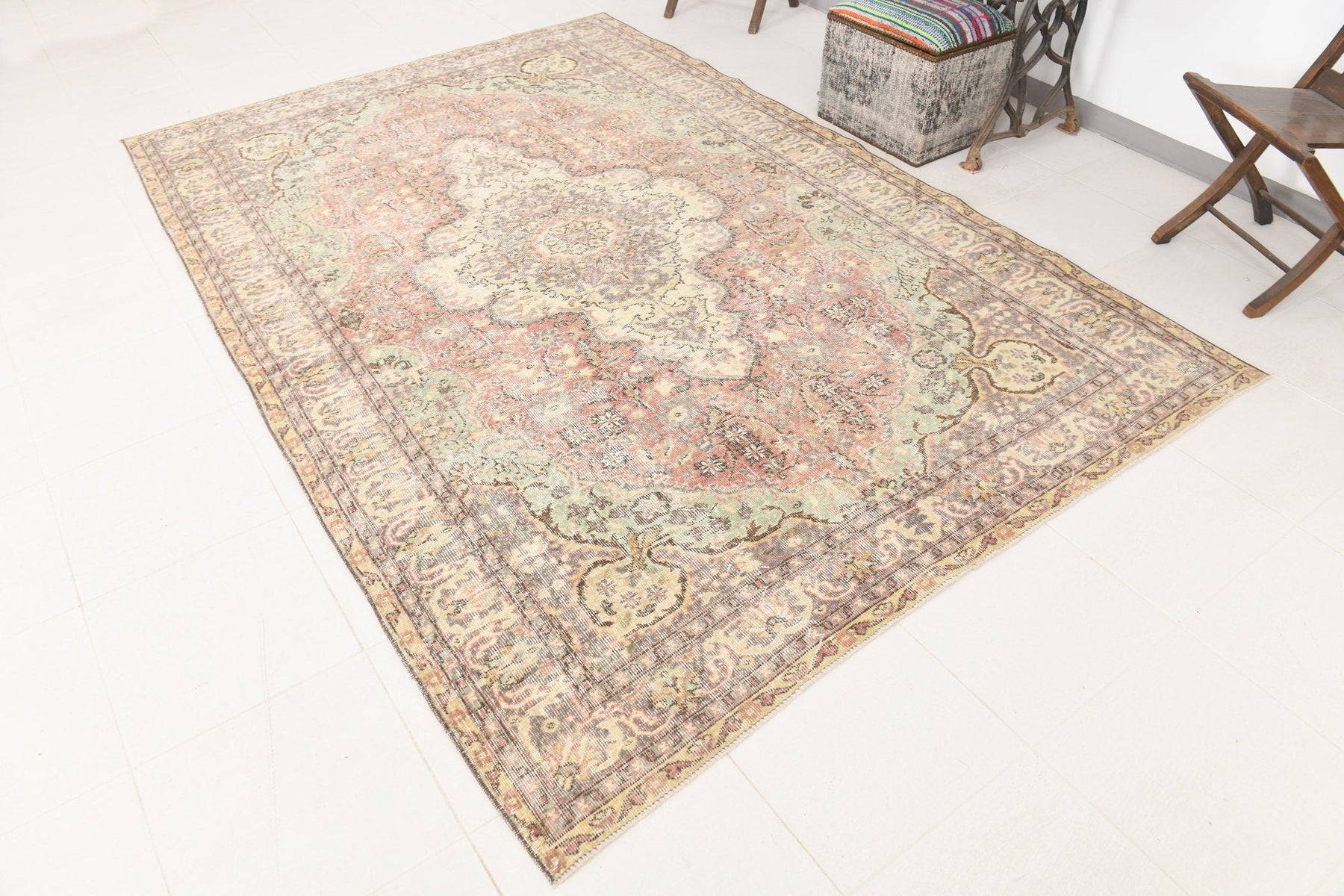 Vintage Boho Area Turkish Rug 6'6" x 9'7" ft, Red/Pink