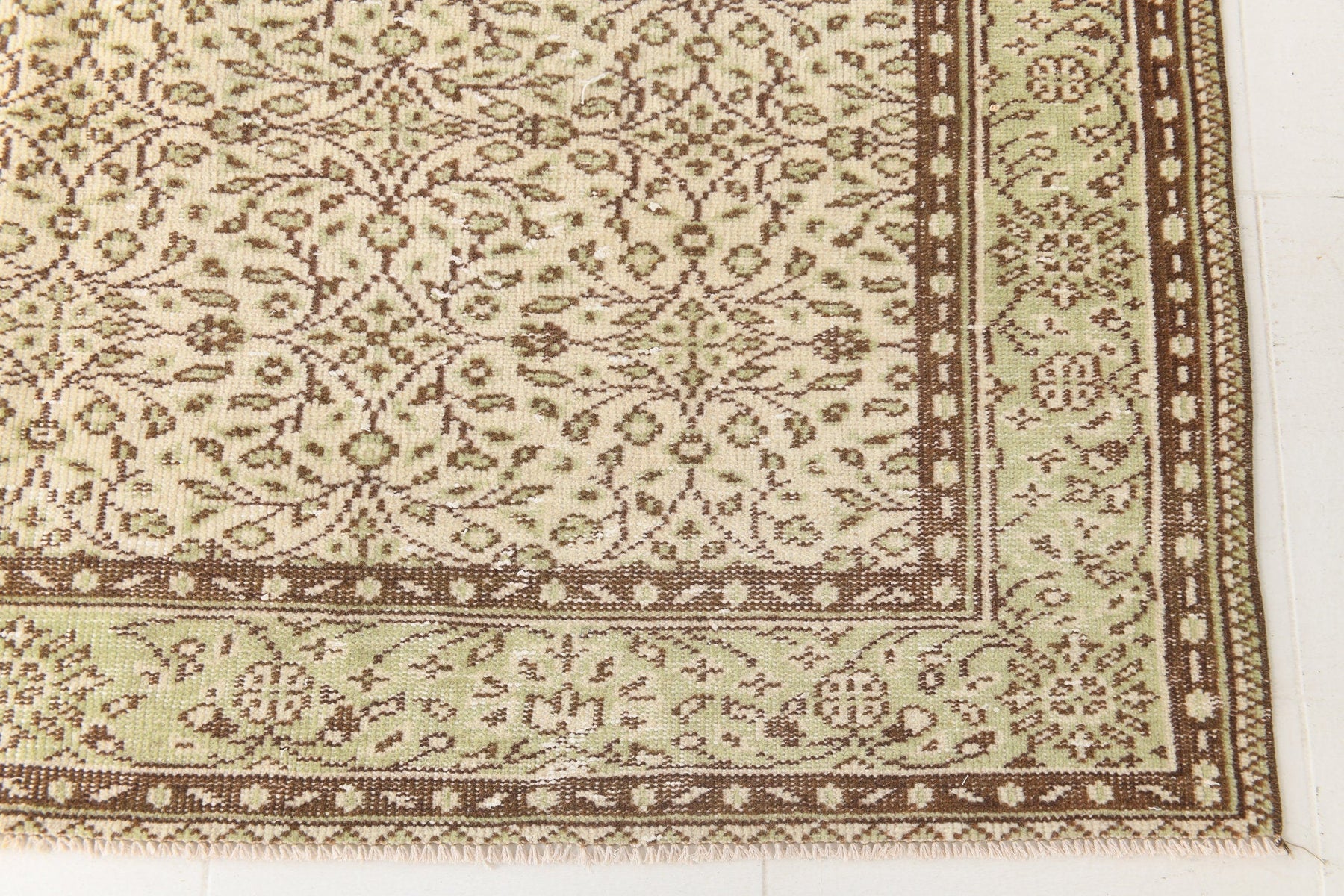 This elegant area rug showcases a timeless design that brings refined sophistication to any space. The ivory main field is adorned with delicate brown floral and geometric patterns, creating a subtle yet intricate visual texture. A light green border with complementary motifs frames the rug beautifully, adding depth and definition. The muted color palette and classic design make this rug a versatile piece that can effortlessly blend with various interior styles, from traditional to transitional.,