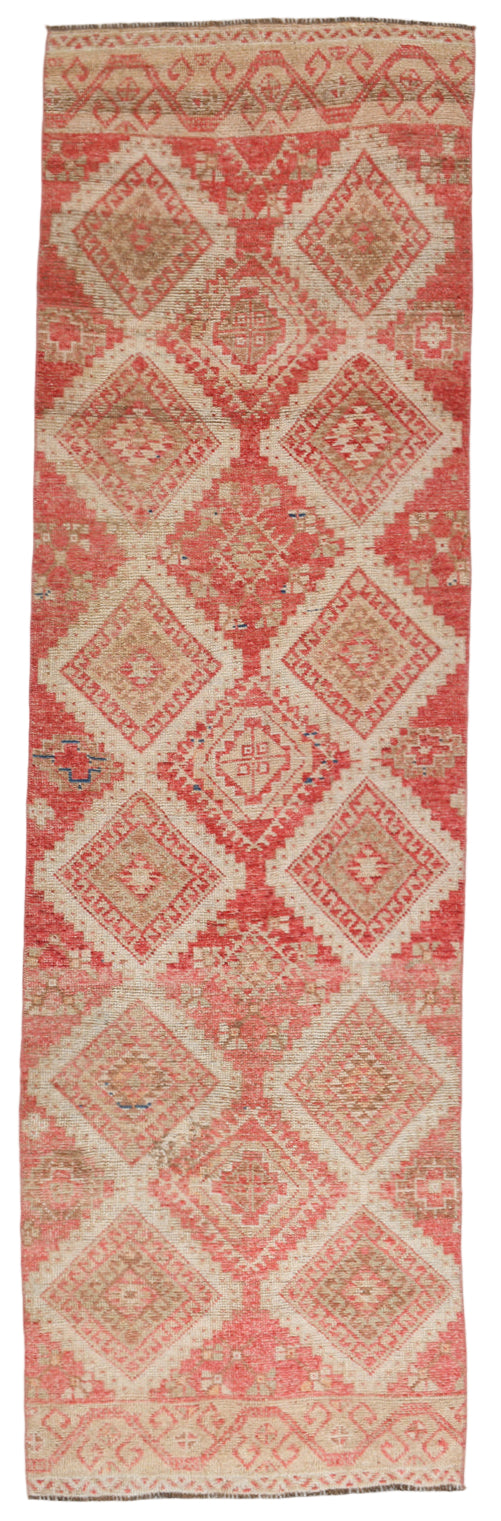 This is a hand-made, one of a kind Vintage Herki Hallway Long Runner Rug, Red. It is meticulously crafted using the Hand Knotted technique, ensuring durability and intricate patterns. It measures 2'12" x 10'0" ft size (91 x 306 cm size) and is made of %50 Wool - %50 Cotton. Its origin is the Eastern Anatolia region and Estimated to have been produced between 1960 - 1970. Washed, cleaned, well-formed, and ready for use.