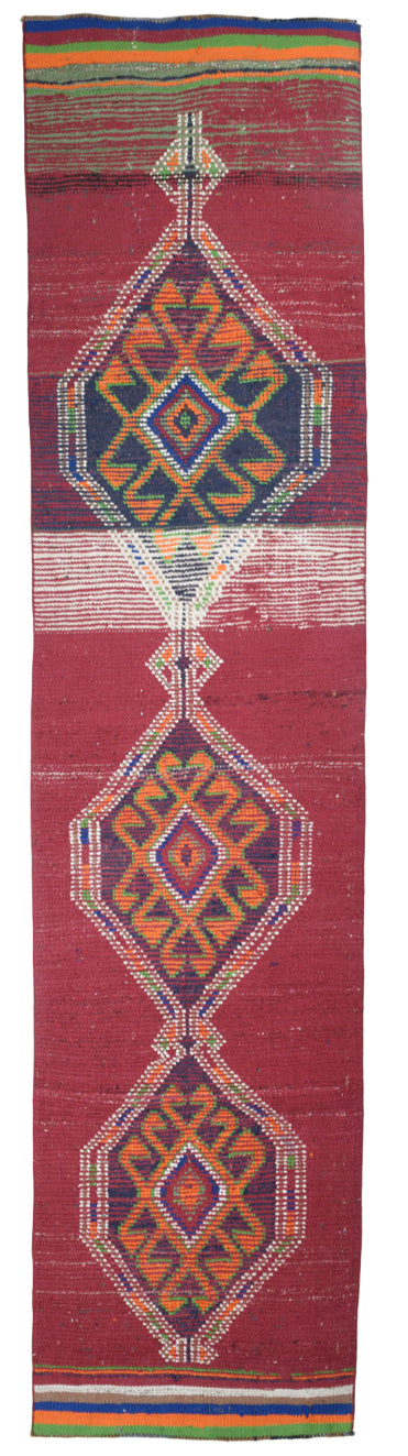 This is a hand-made, one of a kind Vintage Herki Runner Rug. It is meticulously crafted using the Hand Knotted technique, ensuring durability and intricate patterns. It measures 2'9" x 11'9" ft size (83 x 358 cm size) and is made of %50 Wool - %50 Cotton. Its origin is the Eastern Anatolia region and Estimated to have been produced between 1960 - 1970. Washed, cleaned, well-formed, and ready for use.