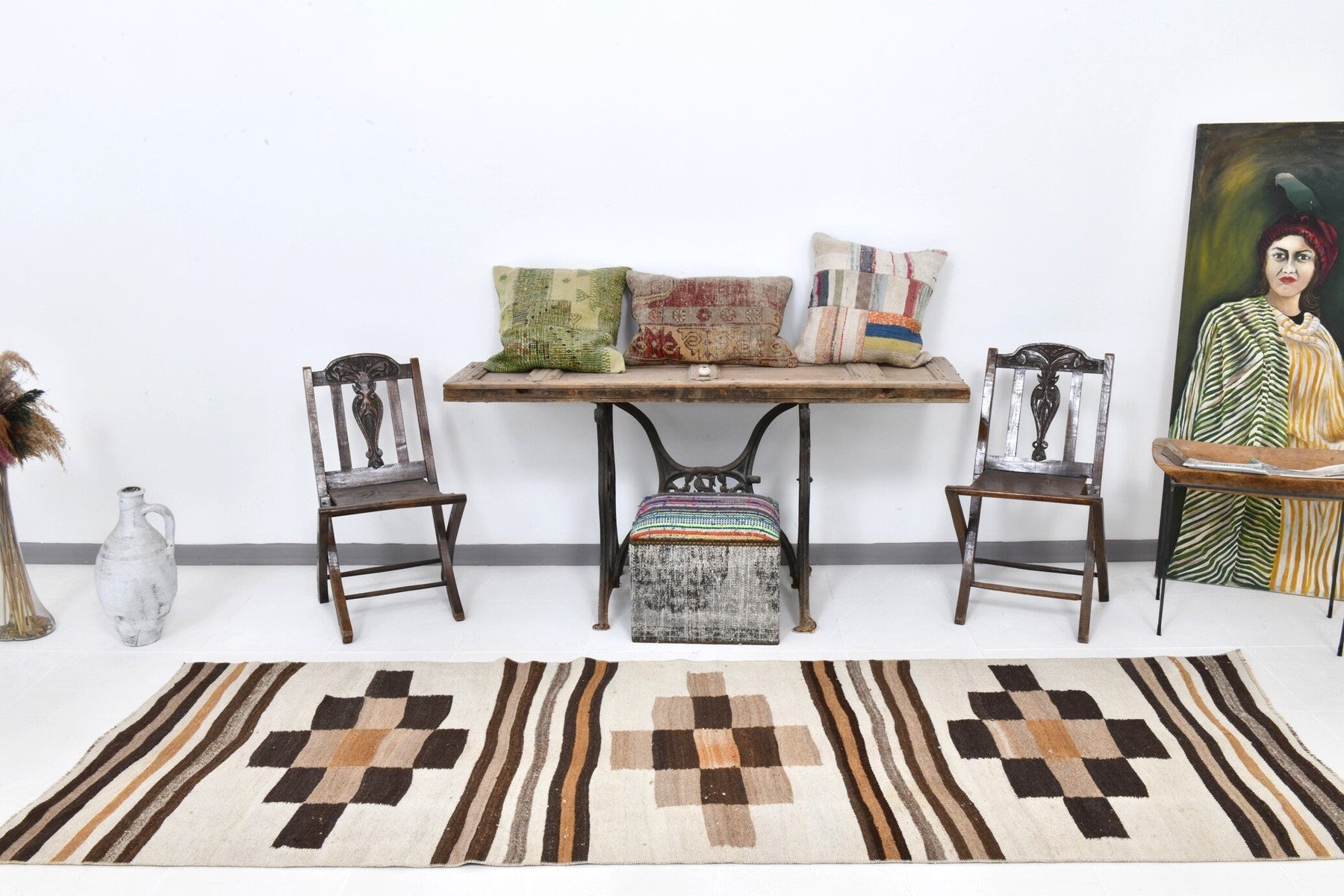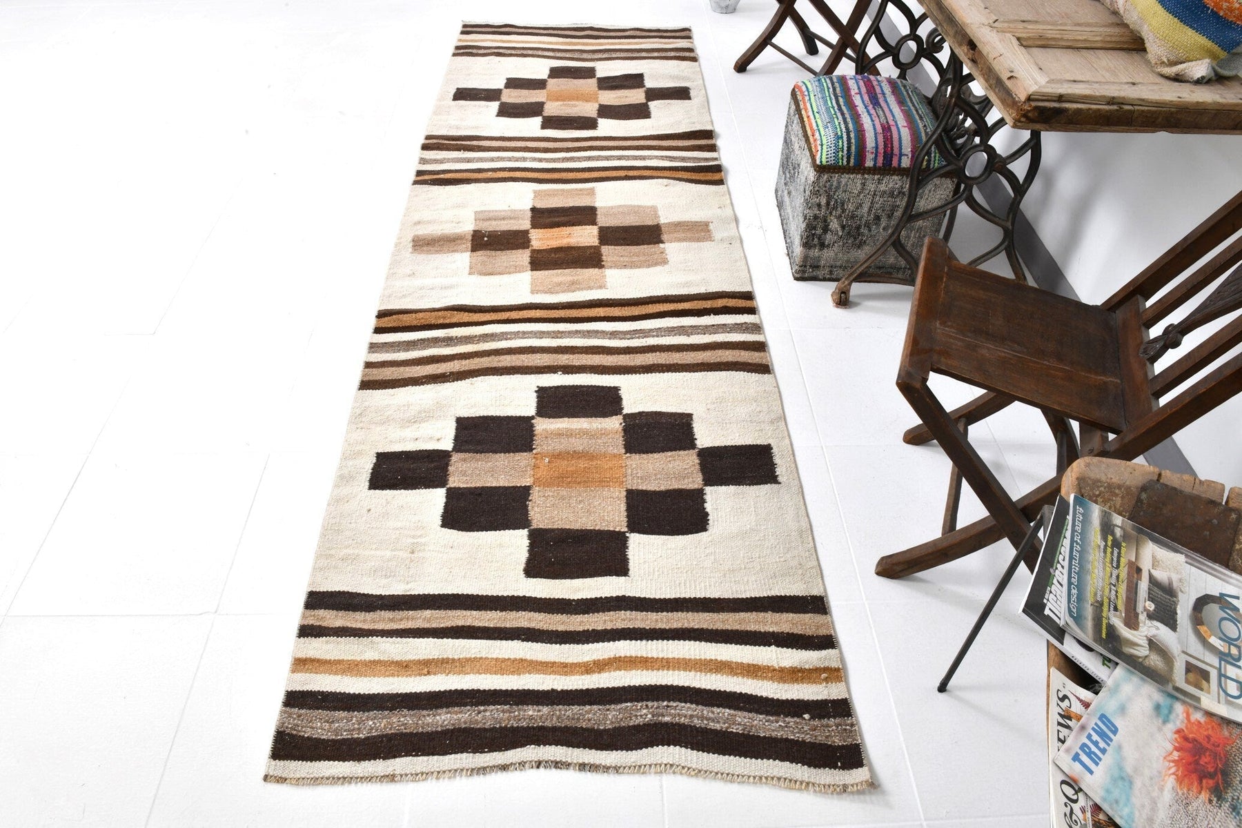 Vintage Turkish Kilim Runner Hallway 3'3" x 10'5" ft Black Cream Brown