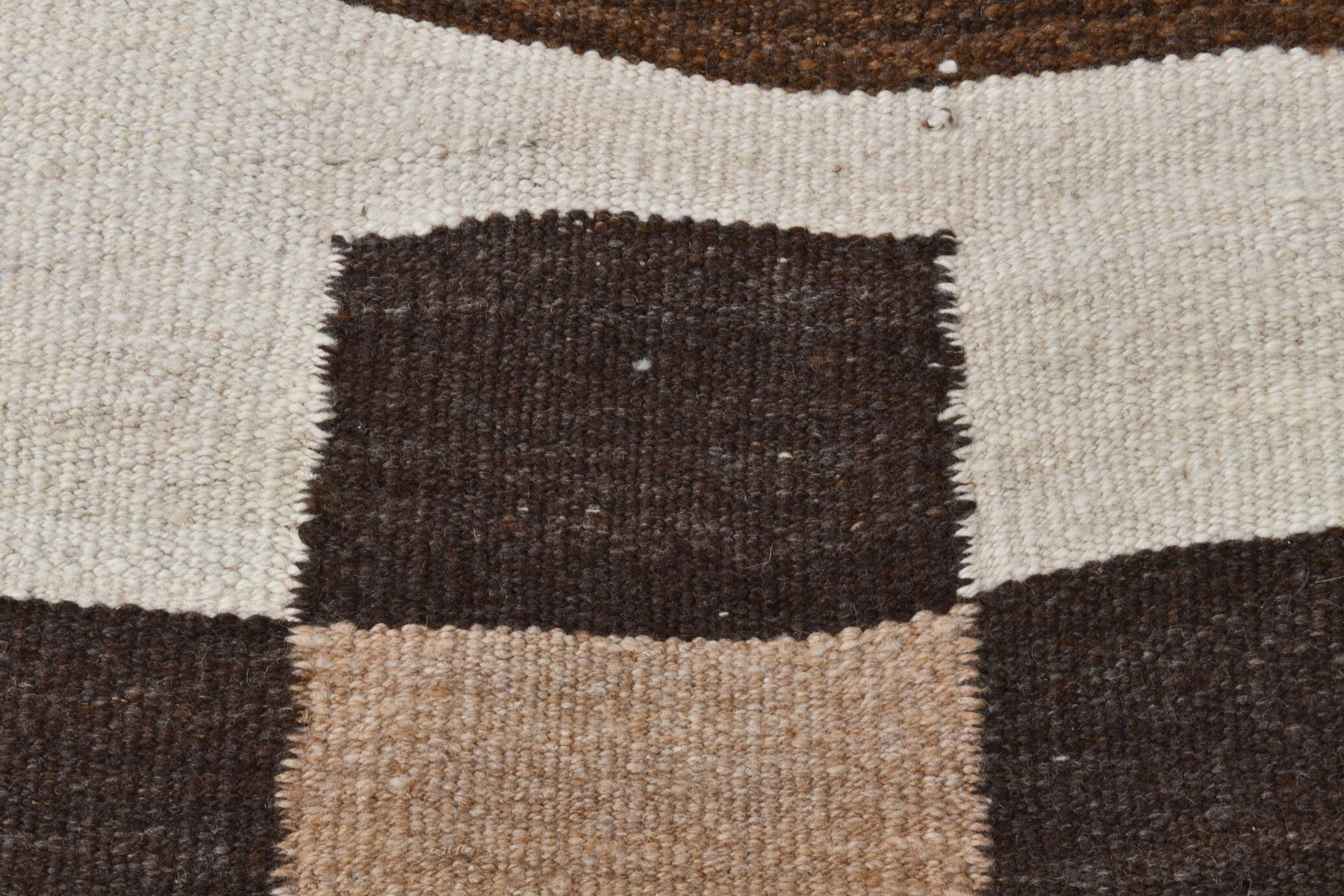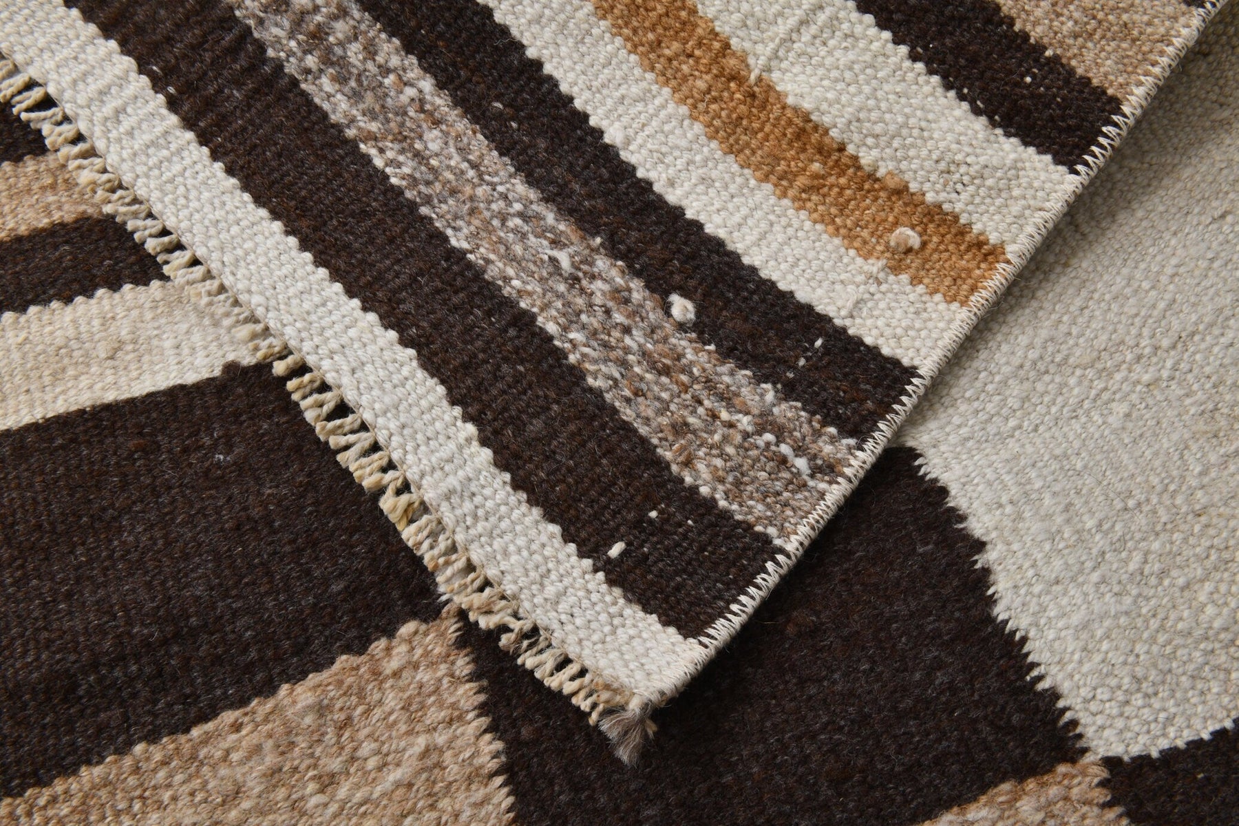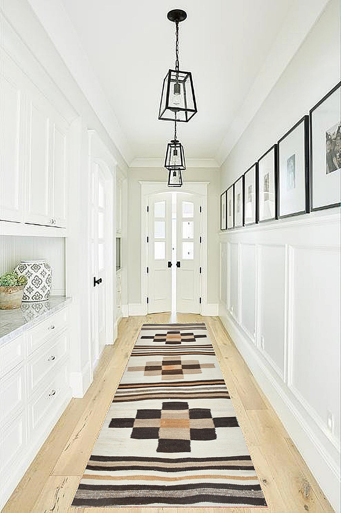 This stunning handwoven runner is a beautiful addition to any home. The natural color palette of cream, brown, and black creates a warm and inviting atmosphere, while the intricate geometric pattern adds a touch of sophistication. The wool construction is durable and long-lasting, making it perfect for high-traffic areas. This runner would be a great choice for a hallway, entryway, or living room.