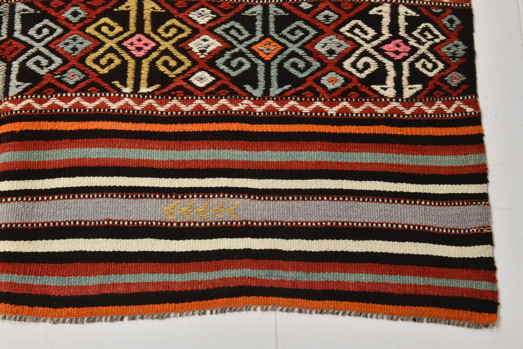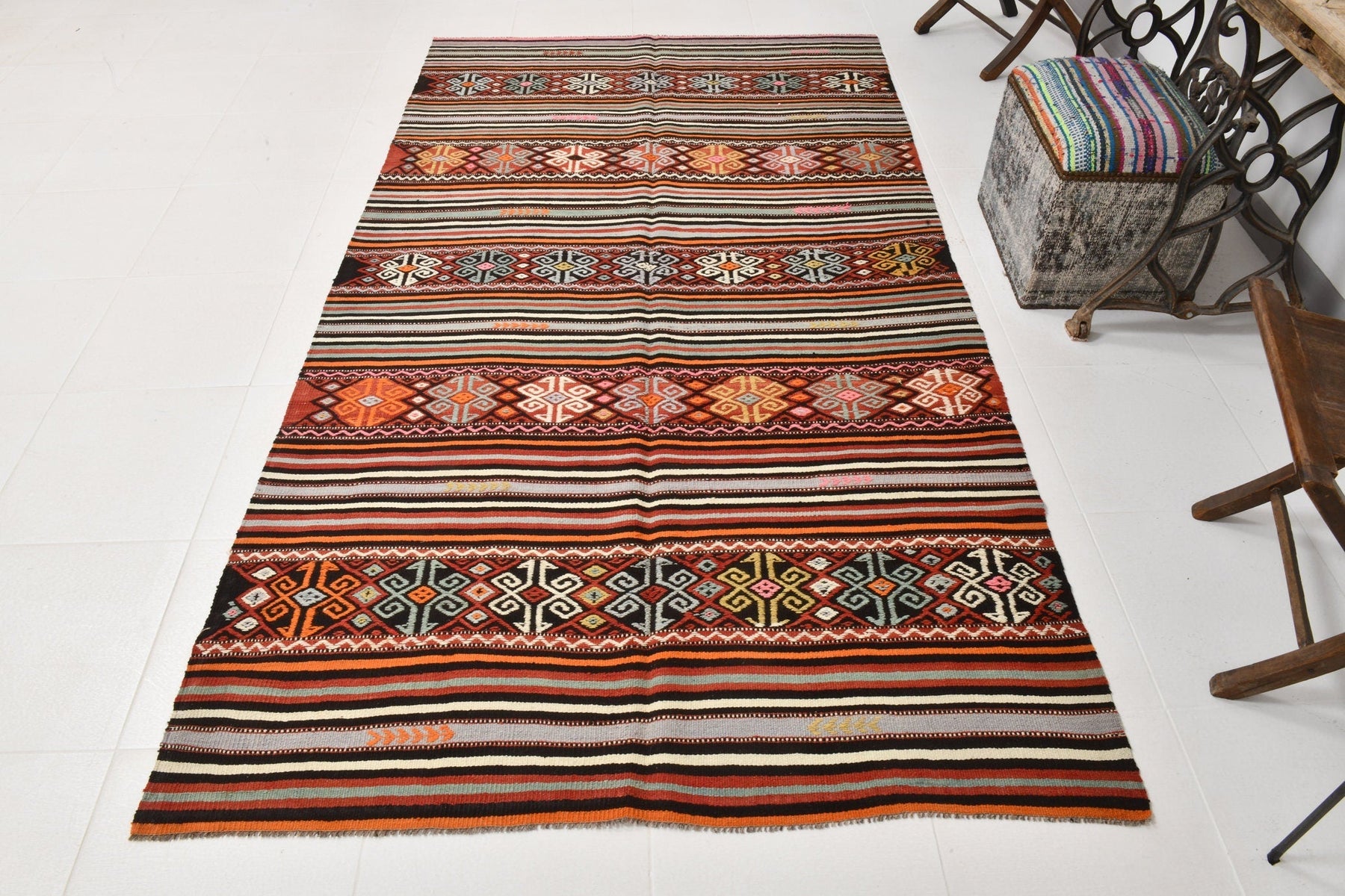 This is a hand-made, one of a kind Vintage Kilim Anatolian. It is created using the Hand Woven technique, offering a unique texture and design. It measures 4'9" x 8'8" ft size (146 x 263 cm size) and is made of %80 Wool - %20 Cotton. Its origin is all regions of Anatolia and Estimated to have been produced between 1960 - 1970. Washed, cleaned, well-formed, and ready for use.