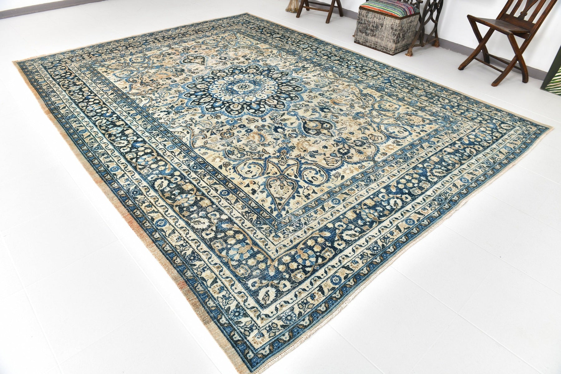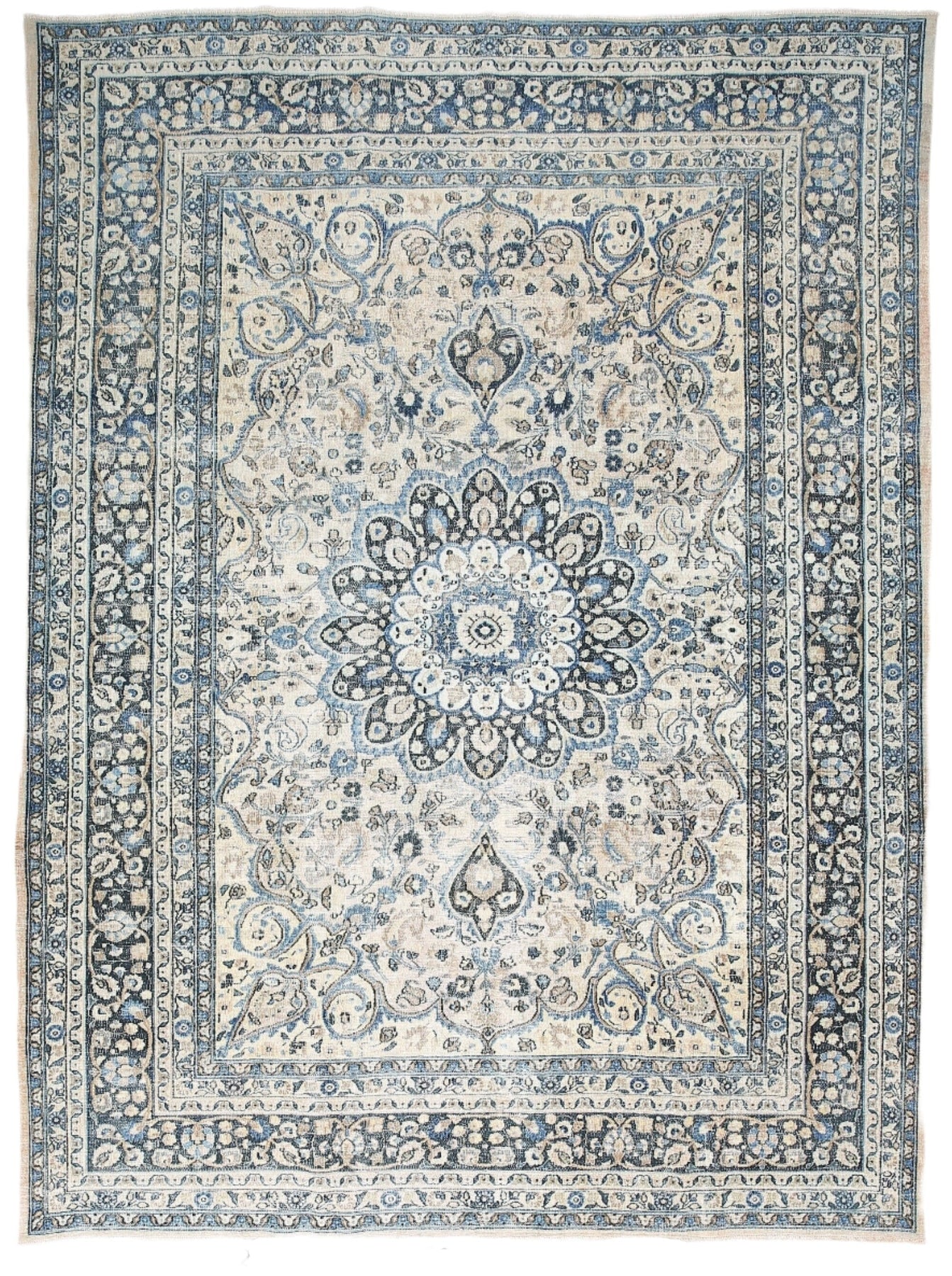 Central motif: A large, intricate geometric or floral motif is placed at the center of the rug.