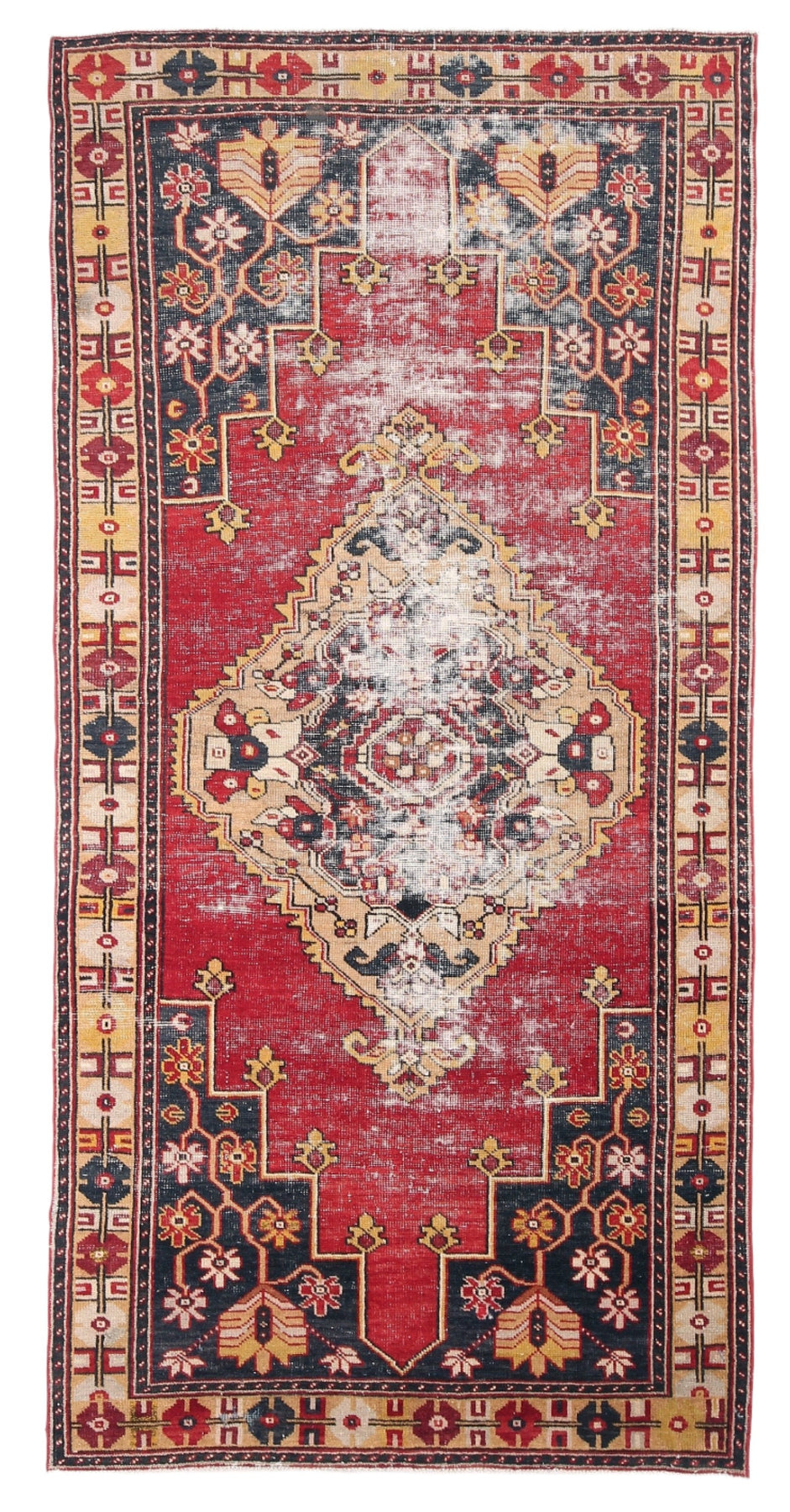 This is a hand-made, one of a kind Vintage Rug Oushak. It is meticulously crafted using the Hand Knotted technique, ensuring durability and intricate patterns. It measures 4'0" x 8'2" ft size (123 x 248 cm size) and is made of %50 Wool - %50 Cotton. Its origin is the Uşak region of Anatolia and Estimated to have been produced between 1960 - 1970. Washed, cleaned, well-formed, and ready for use.